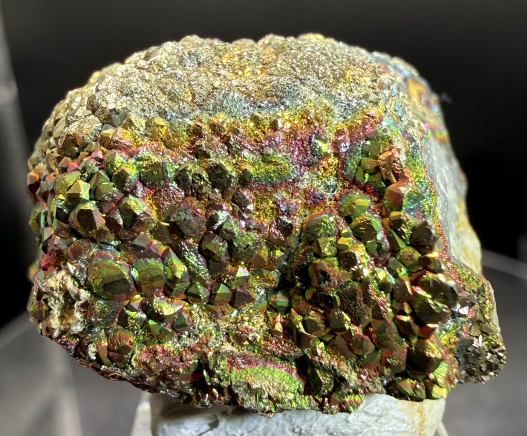最近はYahooのフリマサイトでブルガリアのサンプルをたくさん扱うようになりましたがその中にはパイライト結晶表面に酸化被膜を形成し、標本によって褐色や赤色、黄色から虹色まで多彩な変化をすることを知りました。もしかするとこの酸化というプロセスによって黄色みが増し、それを見た人が金と間違えたことが所以かもしれませんね。